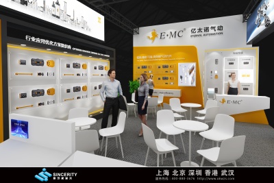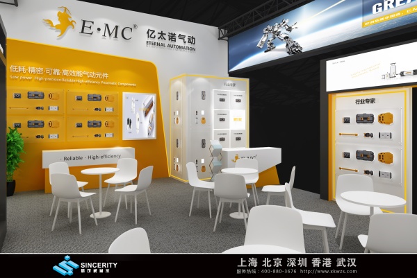 億太諾展會設計以白色和黃色為主色調,營造出明亮、專業的氛圍,展會的頂部和正面都有顯眼的品牌標識 “E?MC 億太諾氣動”,并配有標語 “行業高端氣動元件制造商”,突出了品牌的定位和理念。