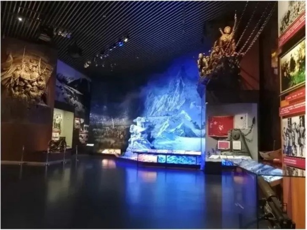 以上圖所展示的渡江戰(zhàn)役”場景為例,謳歌了中國人民解放軍以木帆船為主要航渡工具,一舉突破國民黨軍的長江防線,并以運動戰(zhàn)和城市攻堅戰(zhàn)相結(jié)合,合圍并殲滅其重兵集團(tuán)。場景的展品內(nèi)容非常豐富,其中包含一級標(biāo)題版、圖文展板、人物雕塑、浮雕造型墻、金屬立體字、展柜、燈箱、多媒體等重要文物展品,光影的過渡變化也很自然,既有突出翻越大雪山時艱苦環(huán)境的冷色調(diào),也有勝利跨江會師后讓人喜悅的暖色調(diào)。